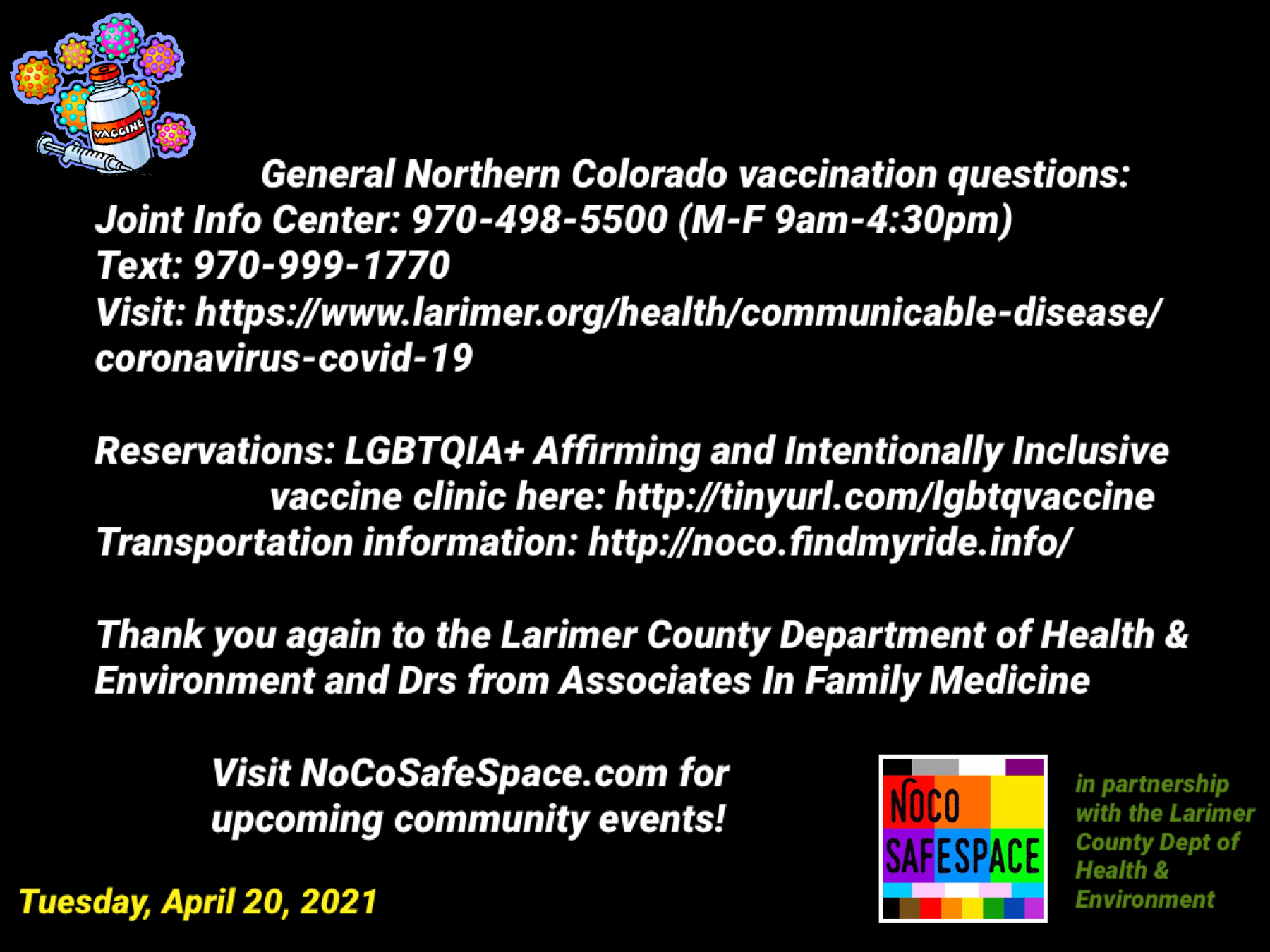 LGBTQIA+ Affirming and Intentionally Inclusive Vaccine Clinic Reservation list at: NoCoSafeSpace.com/health