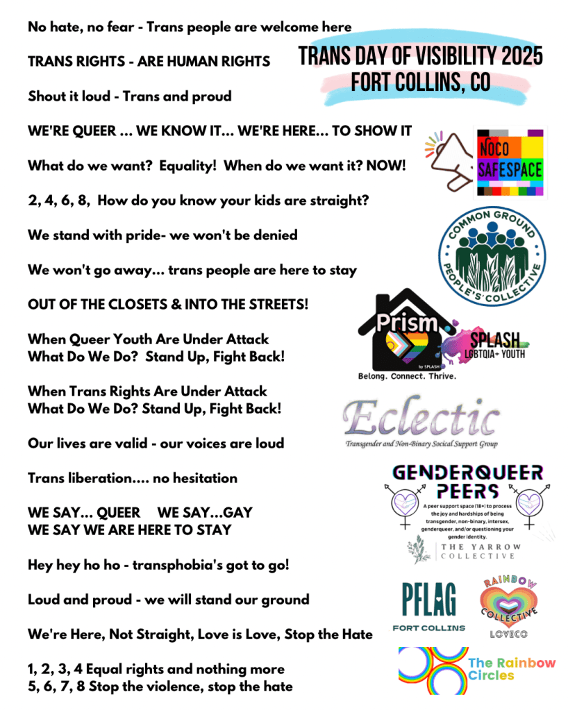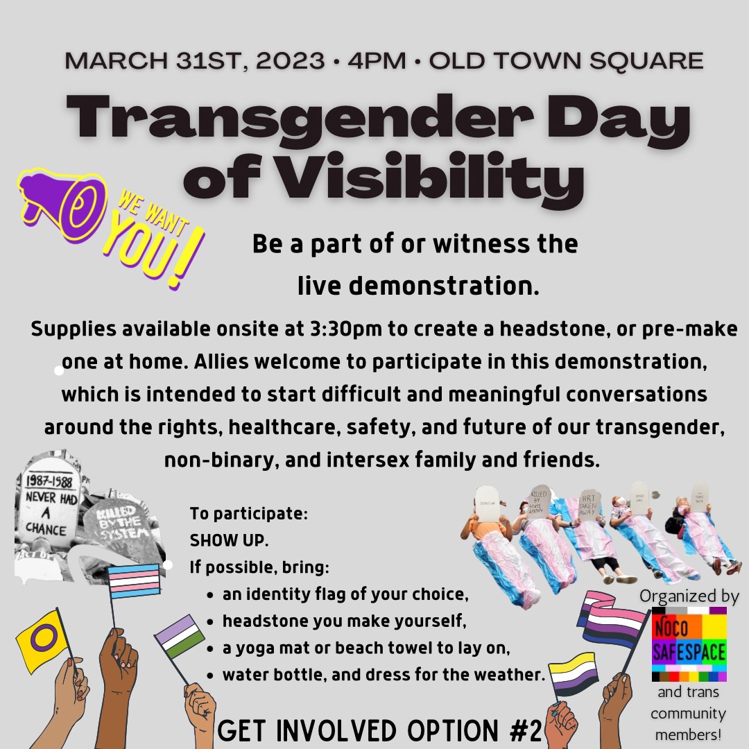 Be a part of the first TDOV demonstration in Northern Colorado. submit a 3-10 second audio recording of SUPPORT YOU NEED deserved as a transgender, non-binary, or intersex person. Your message will be shared over the amplified sound during the demonstration.
