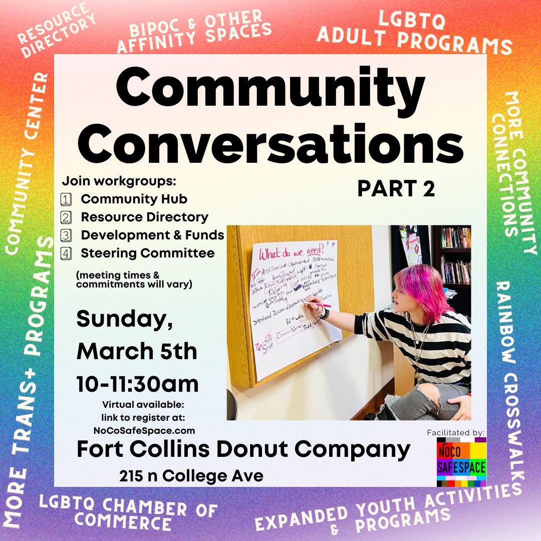 Part 2 of NoCoSafeSpaceโs Community Conversations will be held March 5, 10-11:30am at queer-owned @foco_doco! All community members welcome to join in building our FAMily!